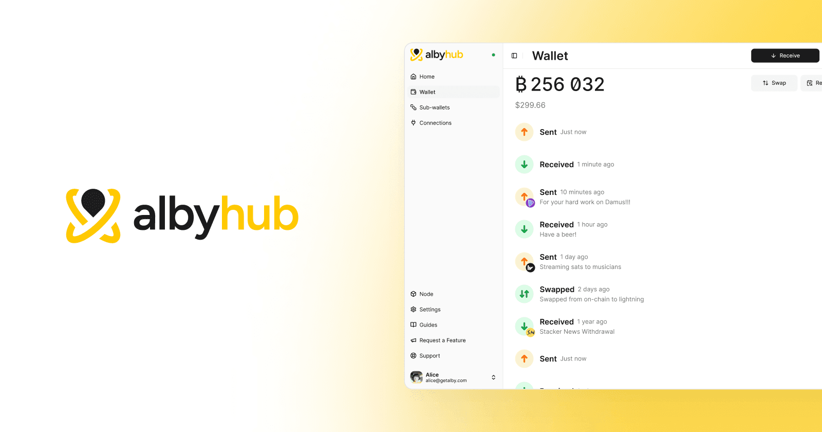 Alby Hub is your own center for the Internet money. It a self-custodial bitcoin lightning wallet that allows you to do more with bitcoin than other wallets you'll find. It's designed with the intention to be used everywhere you want — on the web, within mobile and desktop apps or in physical world while paying for groceries at the store.