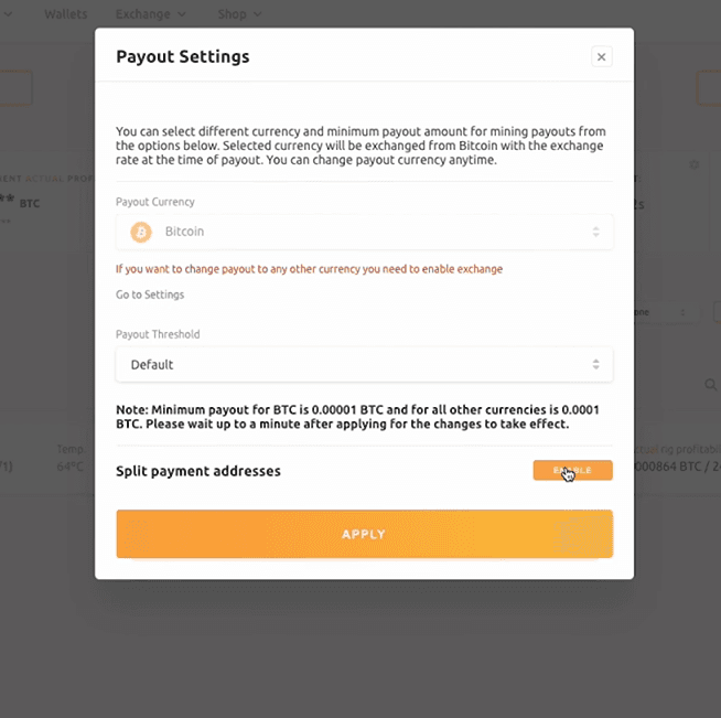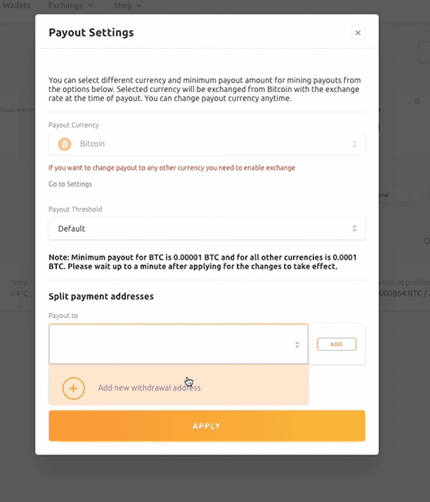 Navigate to Rig Manager and click on click on the Gears icon next to NEXT PAYOUT. (you’ll need to have some funds available already for a payout)