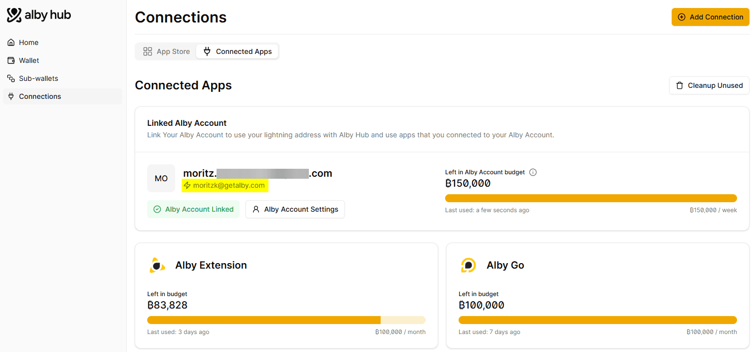 The screenshot shows Alby Hub with your Alby lightning address highlighted in yellow. You also see the power of Alby Hub connecting several apps like the Alby Browser Extension or Alby Go.
