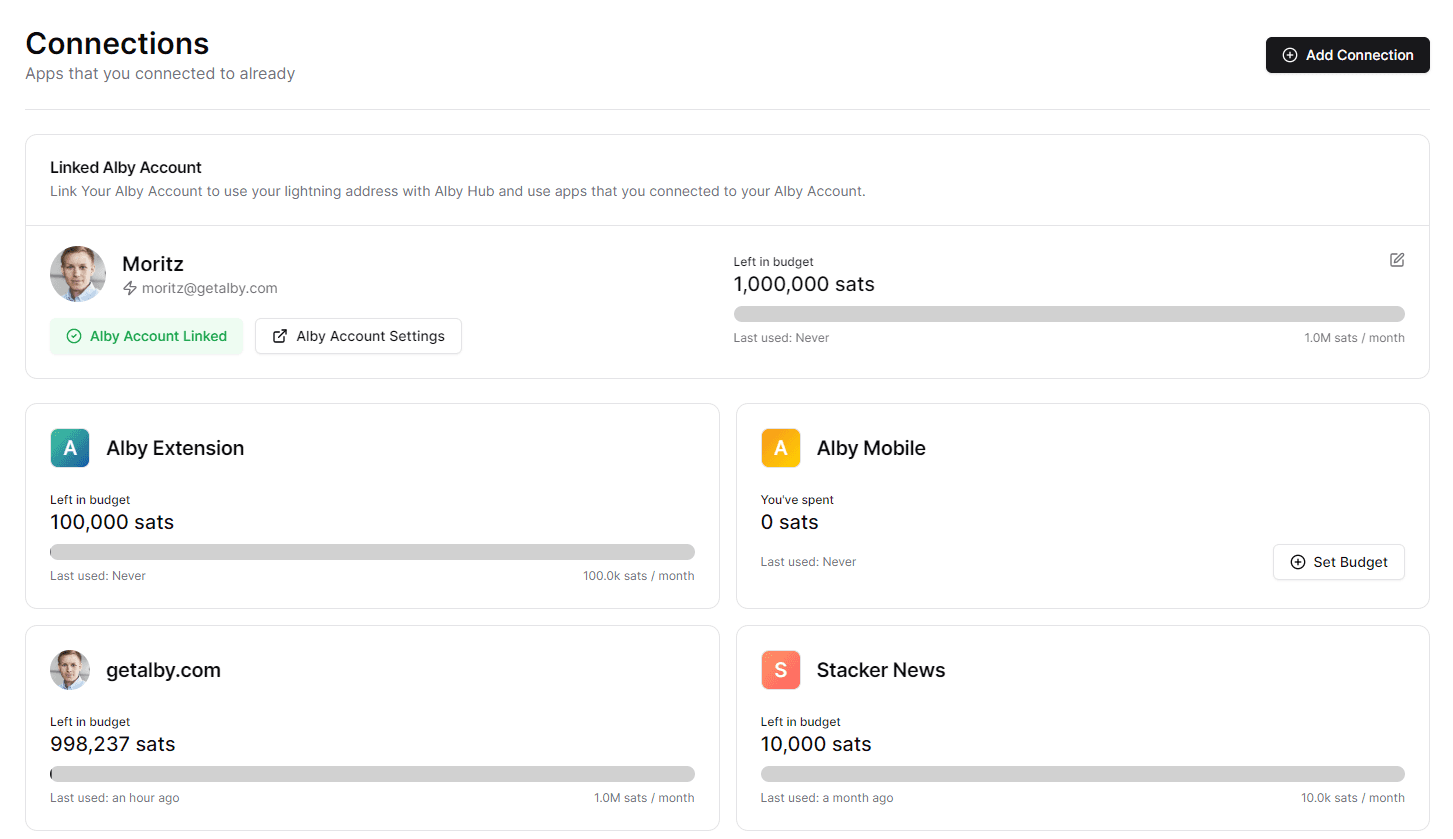 Alby Hub is your self-custodial lightning wallet, and its ability to connect with apps is its superpower. This capability is unique in the bitcoin ecosystem and has the potential to transform how apps integrate payments in a lasting way. Instead of requiring upfront deposits and trusting apps with your bitcoin, you can connect your Hub to any app to pay and receive directly from your own node. No upfront deposits, no risk of missing bitcoin—just plug in and out with your Hub.