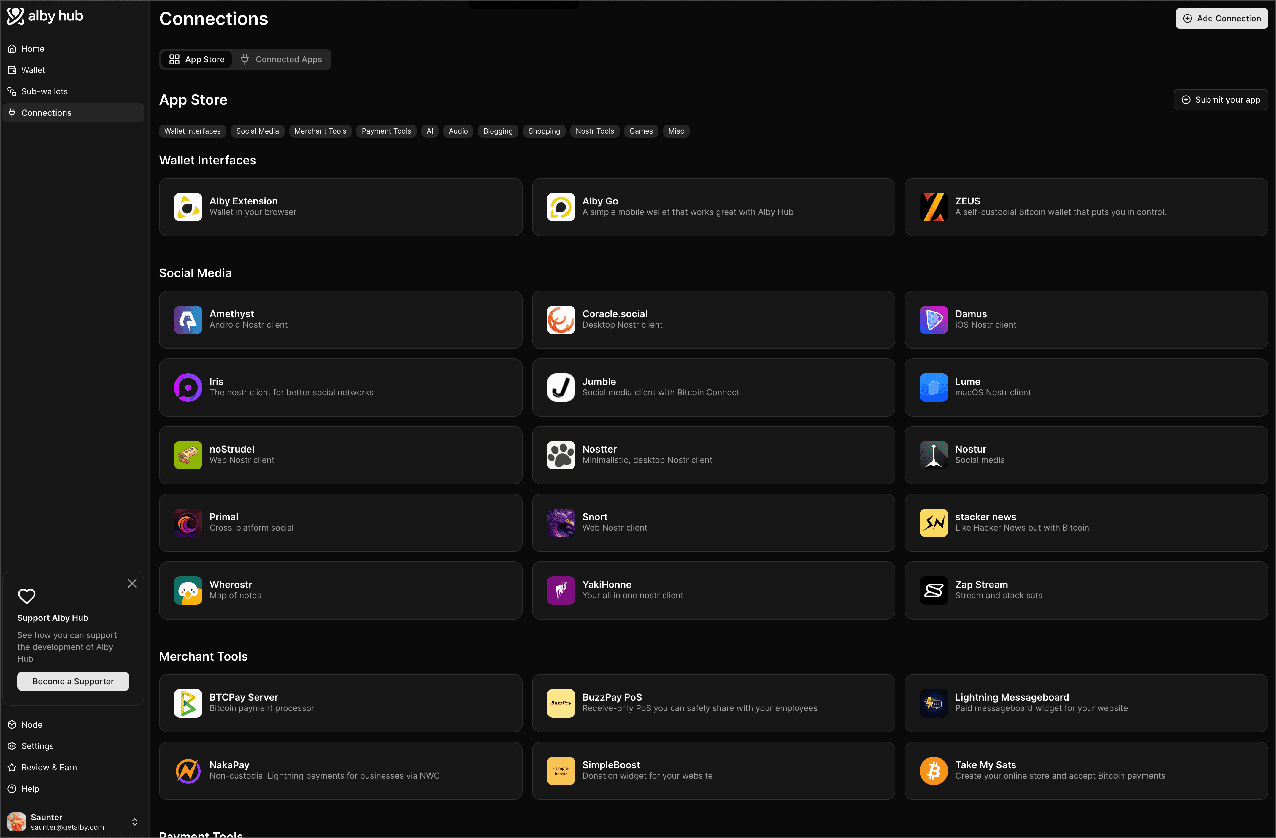 Alby Hub also offers an integrated app store, featuring a wide range of apps—from chat and content apps to games, music, video, and more.