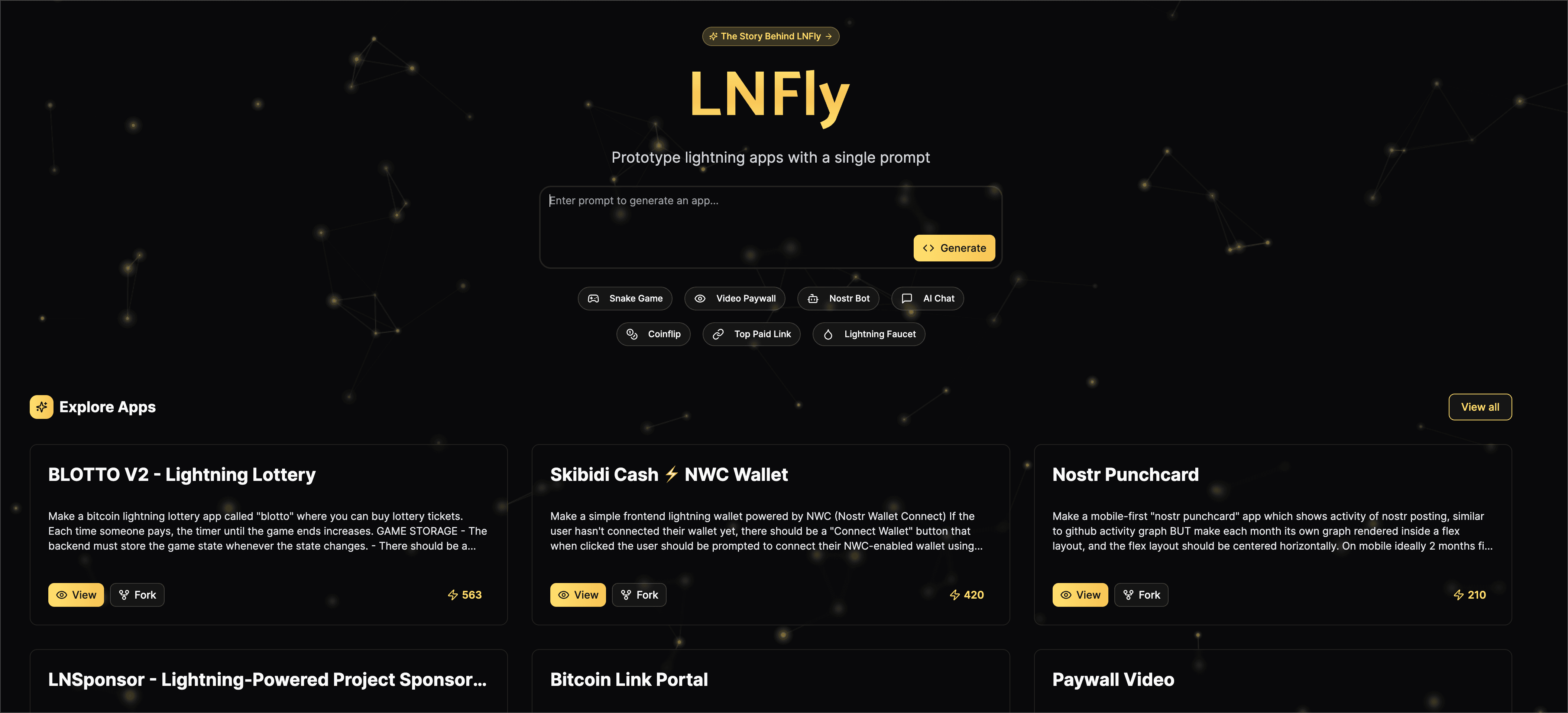 LNFly lets you fork every app to build on top or generate a new one from scratch - no code required.