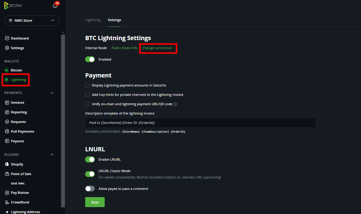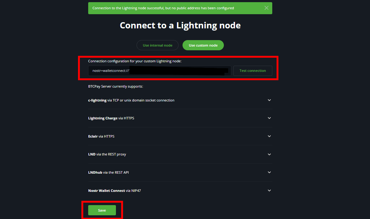 In the “Settings” page of the “Lightning” section, you’ll see “Custom Node nwc“ just as in the image above.